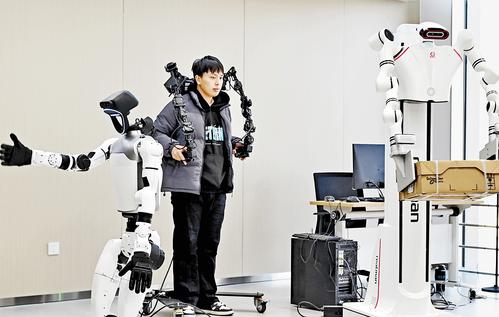 1月6日,在中国雄安集团数字城市科技有限公司的具身智能训练场内,数据采集员正对异构机器人进行具身智能训练。 本报记者 刘光昱摄 “小雄,跳个舞吧!”“小雄,点个赞!”1月6日,在中国雄安集团数字城市科技有限公司的具身智能训练场,人形机器人“小雄”随着指令灵活做出动作,并向来访者热情介绍:“欢迎来到我们的‘机器人课堂’。” 这座刚刚投入使用的训练场,被称为未来之城的“机器人课堂”。