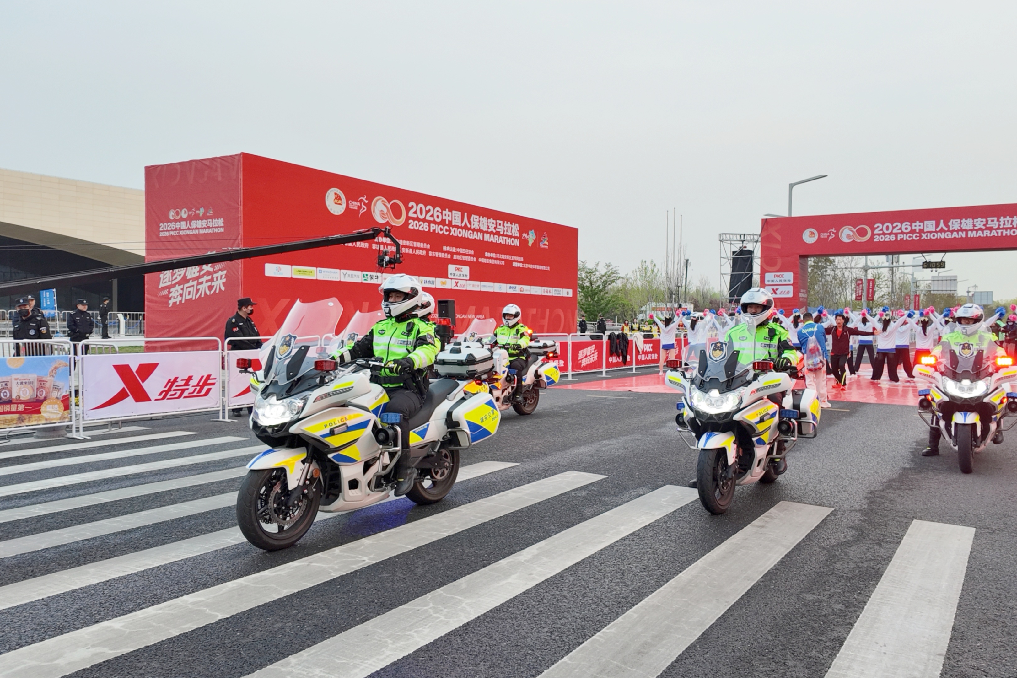 4月12日7时30分,2026雄安马拉松在雄安城市计算中心鸣枪开跑,1.2万名跑者齐聚这座拔节生长的“未来之城”,用脚步丈量城市发展的壮美画卷。 赛道上,跑者们奋力向前、逐梦奔跑;赛道旁,一抹抹坚定的藏蓝身影默默坚守、全程守护。 2026雄安马拉松现场。