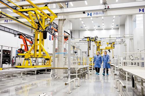 近日,蓝箭鸿擎(雄安)空间科技有限公司员工对卫星产线进行巡查。 本报记者 李东宇摄