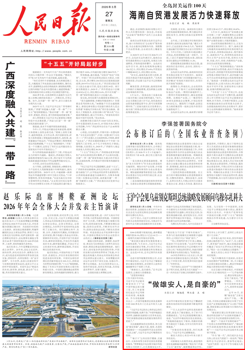 3月27日,人民日报头版以《“做雄安人,是自豪的”》为题,聚焦雄安新区承接北京非首都功能疏解这一核心任务,报道央企总部、高校等疏解项目加速落地,启动区建设如火如荼推进的生动场景。报道呈现中国华能、北京四中雄安校区等疏解项目落地成效,记录总书记关心疏解人员通勤、子女教育、生活保障等细节。文章以鲜活案例展现“新雄安人”扎根热土、干事创业的昂扬风貌,5300余栋楼宇建成、城市功能不断完善,印证雄安正向着新时代宜业宜居的“人民之城”稳步迈进,让“做雄安人,是自豪的”成为全体建设者与新区居民的共同心声。