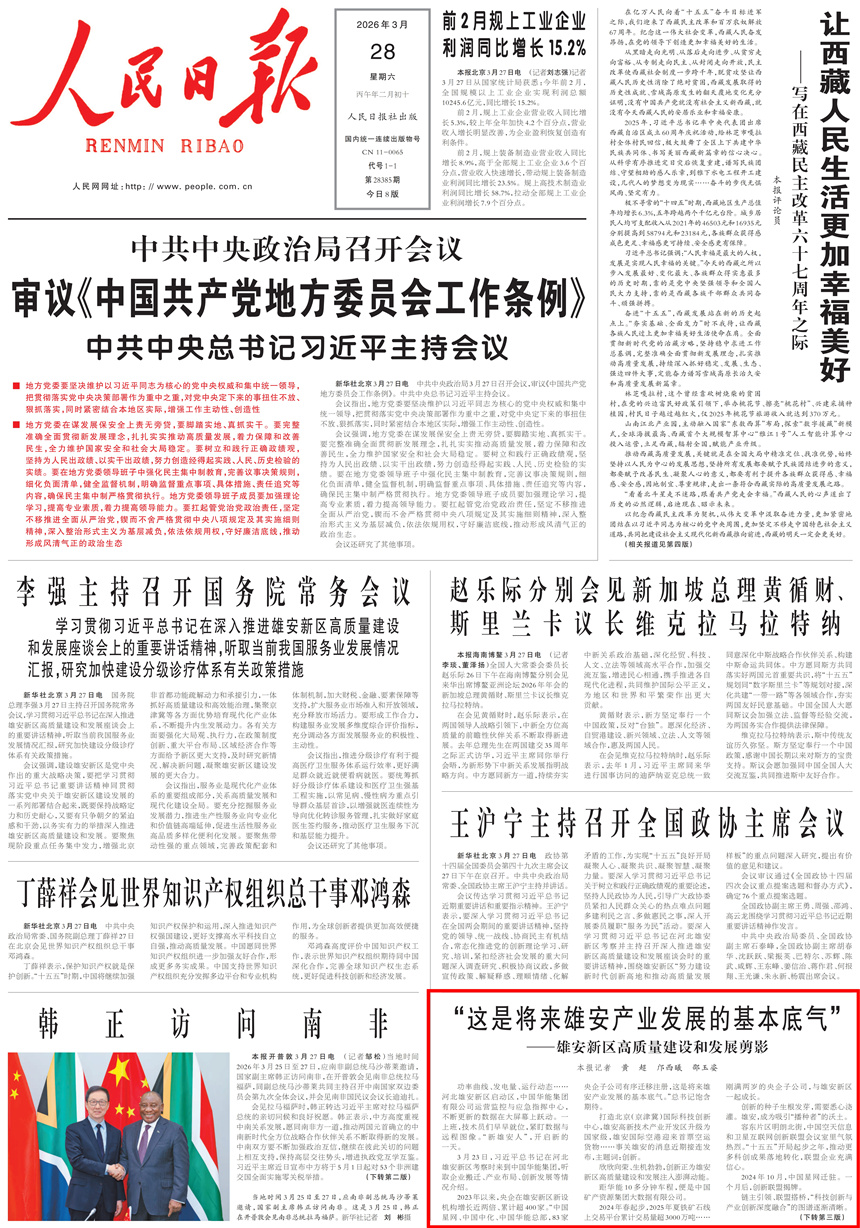 3月29日,人民日报头版刊发《“一体抓好高质量建设和高效能治理”——雄安新区高质量建设和发展剪影》,通过一线走访、实地探访,展现雄安新区广大干部群众牢记总书记嘱托、真抓实干、锐意进取的精神风貌。稿件聚焦城市建设、产业发展、民生保障、基层治理等多个领域,记录企业扎根兴业、群众安居乐业的生动场景,呈现雄安在高效能治理中保障高质量建设、在高质量建设中提升民生福祉的良好态势,用鲜活案例印证雄安新区建设发展的扎实成效。