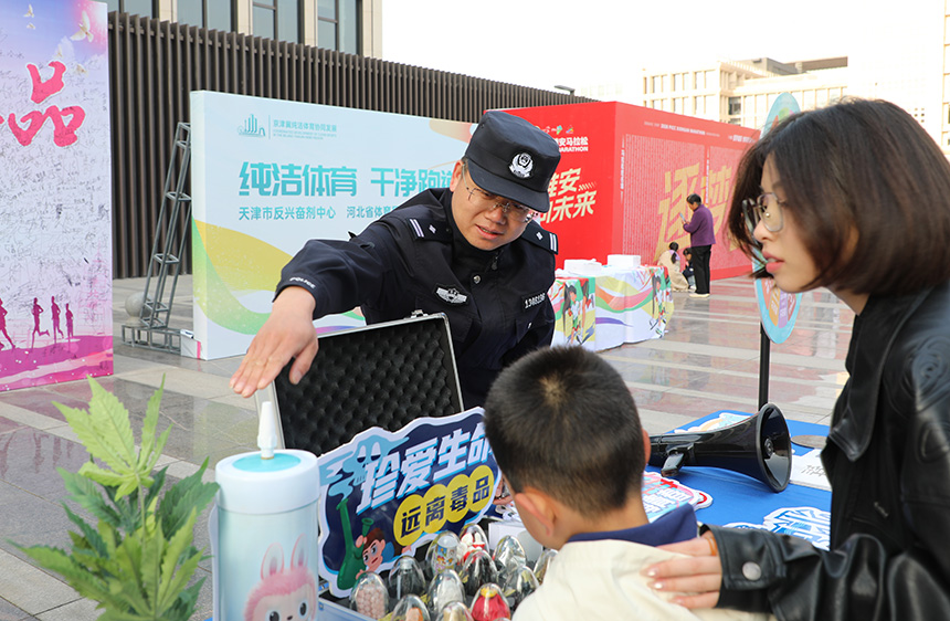 此外,雄安公安还将禁毒宣传融入赛事嘉年华,现场设置的“珍爱生命 拒绝毒品”主题签到墙前,挤满了前来签名的选手和群众;民警们通过仿真毒品模型展示、宣传展板讲解、互动问答等形式,生动揭露新型毒品的伪装和危害。