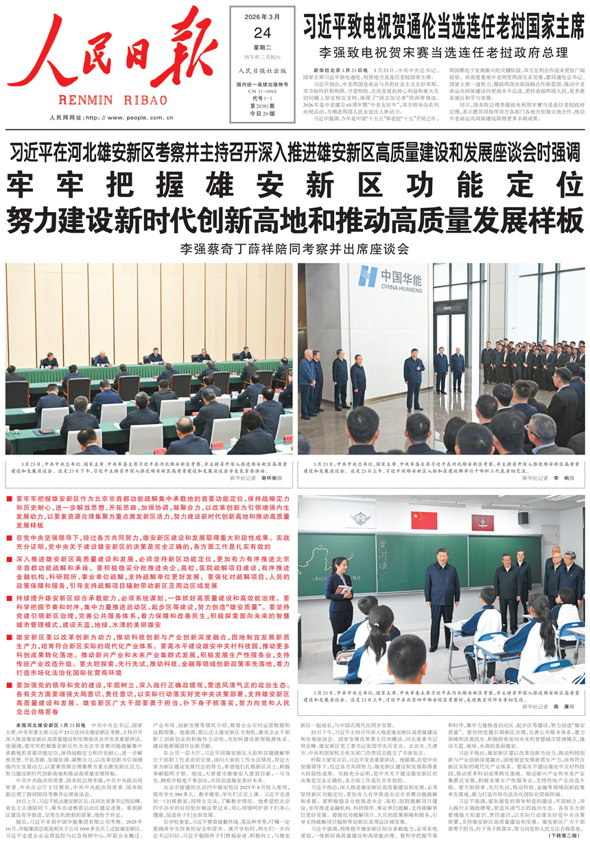 “要牢牢把握雄安新區作為北京非首都功能疏解集中承載地的首要功能定位”“對雄安的發展前景,我們充滿信心”“城與澱應該是相互輝映、相得益彰”“做雄安人,是自豪的”…… 一句句殷殷囑托,一聲聲鏗鏘指引,飽含著對雄安新區的深情關懷與殷切期望。 3月23日,習近平總書記九年間第四次親臨河北雄安新區考察,主持召開深入推進雄安新區高質量建設和發展座談會並發表重要講話,為這座承載“千年大計、國家大事”的“未來之城”凝心聚力、鼓勁加油。 從3月24日到3月29日,人民日報頭版連續六天聚焦雄安,全方位多角度展現雄安新區深入貫徹落實習近平總書記重要講話精神的生動實踐,記錄新區高質量建設和發展的重大成果與光明前景,鐫刻下這座新城拔節生長、闊步前行的堅實足跡。