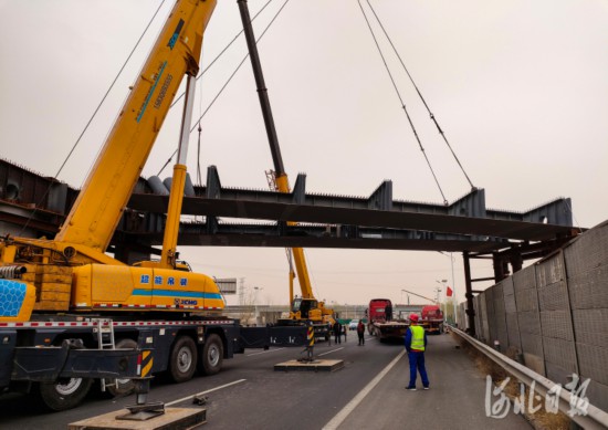 3月17日,在榮烏高速公路新線京台高速至京港澳高速段ZT5標段獨流樞紐互通,建設者們正在進行鋼架橋梁吊裝作業。河北日報記者耿輝攝