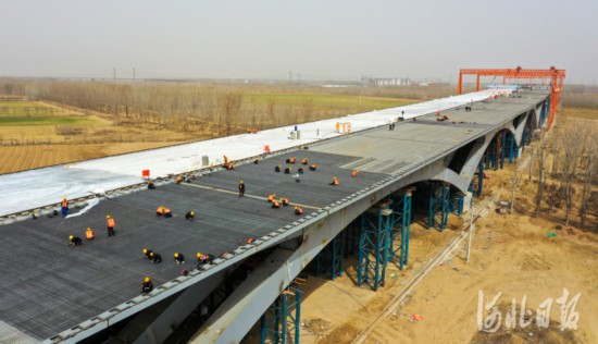 3月16日,在京雄高速SG5標段項目白溝河特大橋,建設者們在進行路面鋼筋捆扎施工作業。河北日報記者耿輝攝