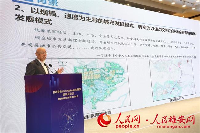 雄安新區管委會主任特別顧問趙鵬林作《關於都市圈快速軌道交通發展的思考》主旨報告。中國雄安集團供圖