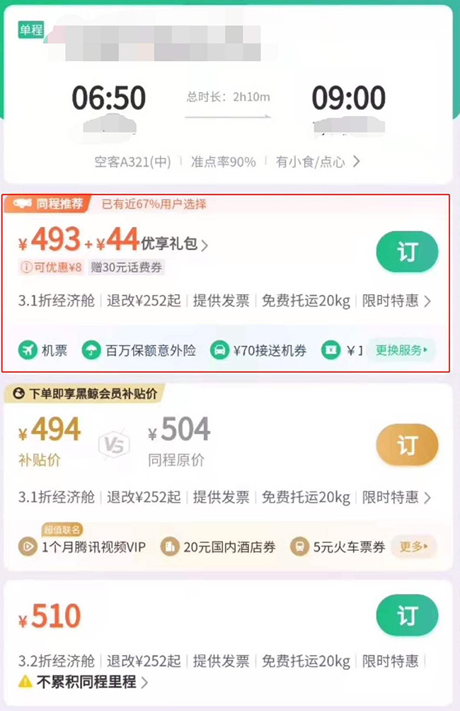 記者隨機選擇一趟航班,標價為493元+44元優享禮包的票源,訂單顯示默認價格為587元,該價格包含493元機票+44元優享禮包+50元機建燃油費。