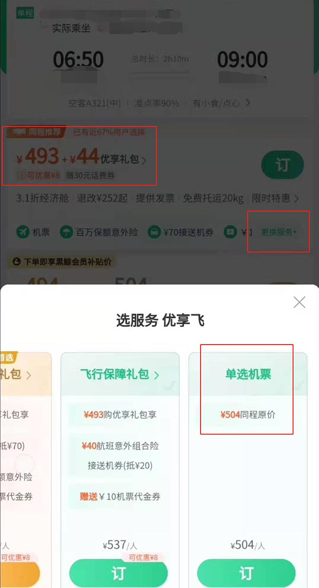 在票源頁面右下角的“更換服務”選項中,記者滑動到最后才發現不購買附加服務的選項。此外,在上述493元的票源下的“更換服務”中選擇“單選機票”,機票價格卻是504元。