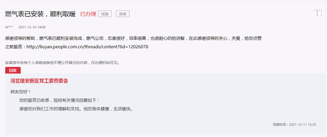 家住雄縣米家務鎮坂東村的胡先生也遇到了關於取暖的煩惱。“我去年夏天便向坂東村委會申請了燃氣表,但是到供暖季了,燃氣表還沒有裝好。”無奈之下胡先生在人民網“領導留言板”留言尋求解決。雄安新區黨工委、管委會在接到訴求后,立即協調進行處理。經查,胡先生家的燃氣管線等設施已安裝完成並具備通氣條件,於是又協調壁挂爐企業對其進行採暖爐具的安裝。