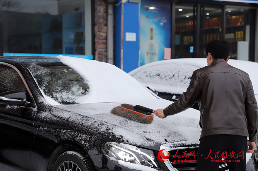 一大早,雄安市民正在清理車上覆蓋的積雪。李康樂攝