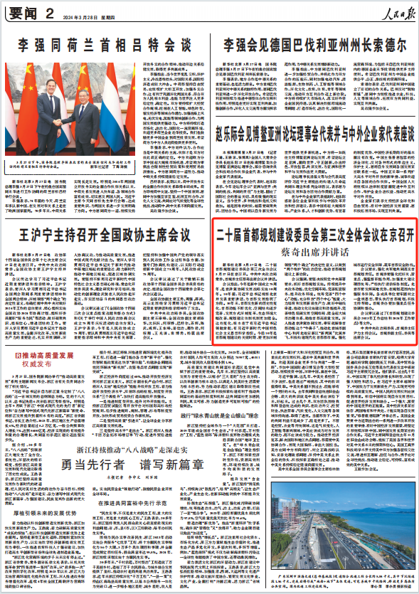會議強調,要堅決按照黨中央部署要求,抓好首都規劃實施。持續提升中央政務功能,優化空間布局,完善配套服務,提升政務環境。統籌完善“四個中心”功能,充分釋放“四個中心”能量,大力培育和發展新質生產力,做好中軸線申遺,推動文化設施建設和功能提升,完善綠色低碳發展空間格局,健全超大城市治理體系,助推首都高質量發展。深入推進京津冀協同發展,牽牢疏解非首都功能這個“牛鼻子”,推動北京城市副中心和河北雄安新區“新兩翼”比翼齊飛,積極構建現代化首都都市圈。強化城市運行安全保障,筑牢首都安全防線。