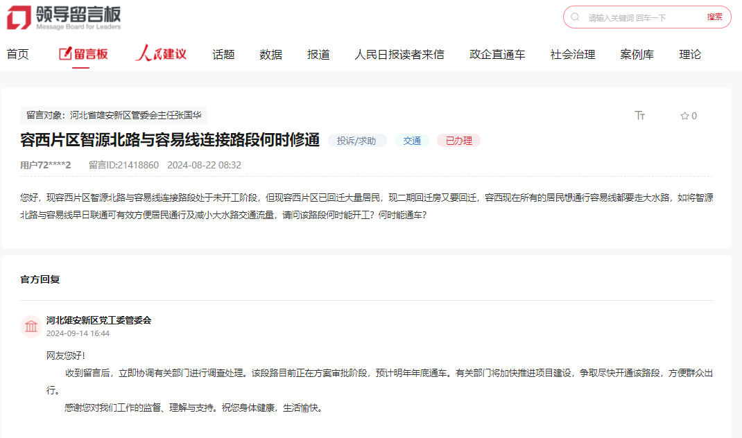 ● 有網友提到,現雄安容西片區智源北路與容易線連接路段處於未開工階段,但現容西片區已回遷大量居民,現二期回遷房又要回遷,容西現在所有的居民想通行容易線都要走大水路,如將智源北路與容易線早日聯通可有效方便居民通行及減小大水路交通流量,請問該路段何時能開工?何時能通車?