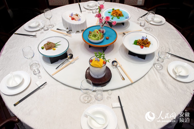 合肥狮城徽宴楼酒店每道菜肴旁边均摆放了公筷。苗子健摄
