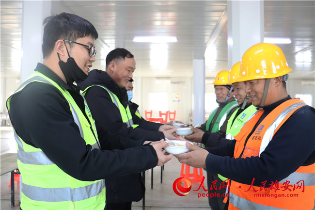 项目部为工人代表送上一碗“团团圆圆”。中建八局供图
