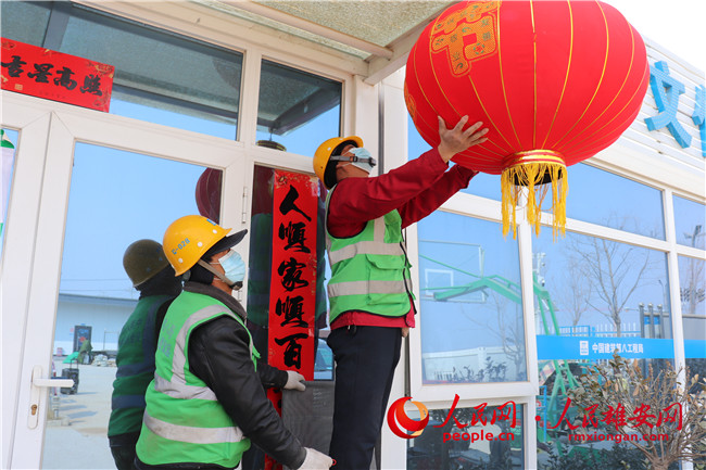 建设者们挂上红灯笼祈福。中建八局供图