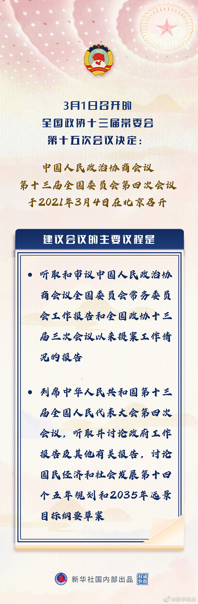 3月1日召开的全国政协十三届常委会第十五次会议决定:中国人民政治协商会议第十三届全国委员会第四次会议于2021年3月4日在北京召开。建议会议的主要议程是:听取和审议中国人民政治协商会议全国委员会常务委员会工作报告和全国政协十三届三次会议以来提案工作情况的报告;列席中华人民共和国第十三届全国人民代表大会第四次会议,听取并讨论政府工作报告及其他有关报告,讨论国民经济和社会发展第十四个五年规划和2035年远景目标纲要草案。