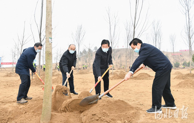 王东峰强调,要牢牢抓住春季植树造林的大好时机,动员全省上下大力推进国土绿化行动。要统筹耕地保护与生态建设,全面落实最严格的耕地保护制度,科学划定生态红线,聚焦燕山—太行山、北京周边、雄安新区、冬奥会张家口赛区和“三沿三旁”等重点区域,加大植树造林力度,进一步提高全省森林覆盖率。要科学编制绿化规划,精心挑选树种,加强林木管护,确保植树成活率,全面提升绿化质量。要创新绿化方式方法,按照政府组织、市场化运作和专群结合原则,坚持生态林与经济林并重,组织动员农村群众调整种植结构,因地制宜种植果树、苗圃,大力发展生态旅游产业,不断增加群众收入,努力实现生态效益、经济效益、社会效益共赢。要充分发挥省四大班子、省直机关和广大领导干部的示范作用,上下联动、齐抓共管,汇聚植树造林强大合力,加快建设天蓝地绿水秀的美丽河北,为“十四五”开好局、起好步提供有力生态支撑。