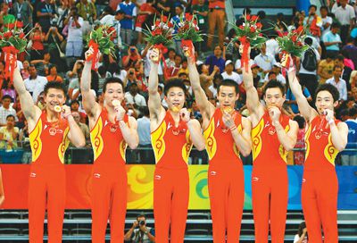 2008年8月12日,中国国家男子体操队获得北京奥运会团体冠军,队员陈一冰、黄旭、李小鹏、肖钦、杨威、邹凯在庆祝夺冠。影像中国