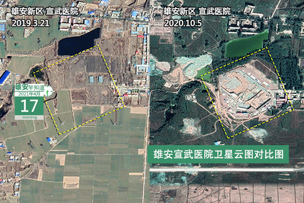 今天是2021年4月17日,星期六,天气晴,7℃~20℃。在封面和大家见面的是雄安新区宣武医院卫星云图对比图。