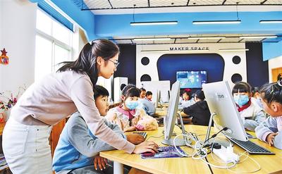 ③北京市海淀区中关村第三小学雄安校区的学生在老师的指导下进行3D打印编程。河北日报记者 耿辉摄