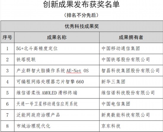 获得优秀科技成果奖的,分别是:中国移动通信集团的5G+北斗高精度定位,中国铁塔股份有限公司的铁塔视联,智昌科技集团股份有限公司的产业群智大脑操作系统AE-Net OS,新华三集团的可编程网络处理器芯片智擎660,维信诺科技股份有限公司的维信诺柔性AMOLED滑移终端,中国电信集团的天通一号卫星移动通信应用系统,新奥数能科技有限公司的泛能网政府治理产品,京东科技的市域治理现代化。