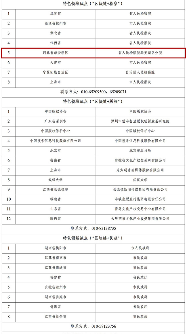 人民网雄安12月22日电 (宋烨文)中央网信办等17个部门发布《关于国家区块链创新应用试点入选名单的公示》,显示雄安新区管理委员会等15个单位入选综合性试点名单,河北省人民检察院雄安新区分院等8个单位入选特色领域试点(“区块链+检察”)名单。此次公示期为12月22日至12月28日。如有异议,可在公示期内联系010-55635305,55635823;010-65209500,65209071。