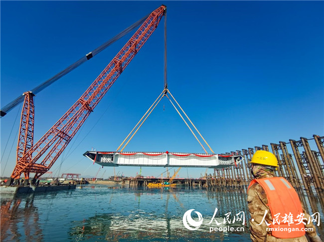 京雄高速北京段永定河特大桥首段钢箱梁吊装现场。中铁上海工程局供图