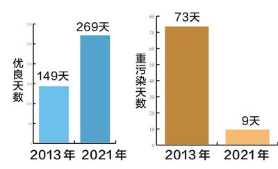 从2013年到2021年,全省PM2.5平均浓度从104微克/立方米下降到了38.8微克/立方米,优良天数由149天增加到了269天,重污染天数由73天减少到了9天。