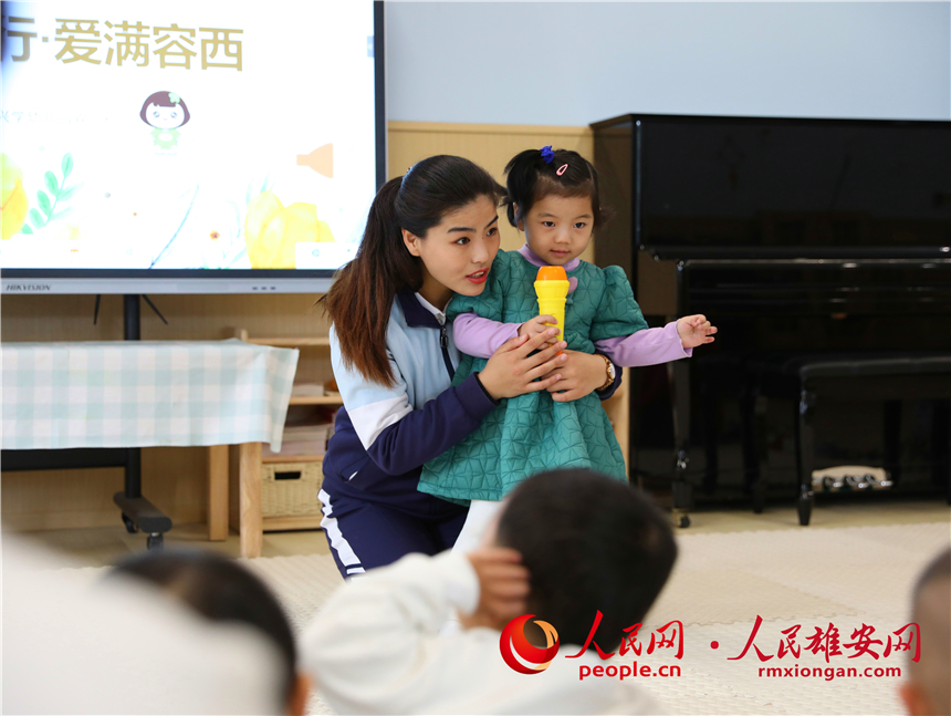 人民网雄安3月18日电 (李雪晴、李兆民)“小朋友们,接下来,我们来问一问‘桃树妈妈’,我们做的桃花漂亮吗?”3月17日,雄安新区首个公益亲子早教班在雄安容西兴学幼儿园开班,围坐一圈的家长萌娃们正在早教老师的带领下进行有趣的游戏互动。