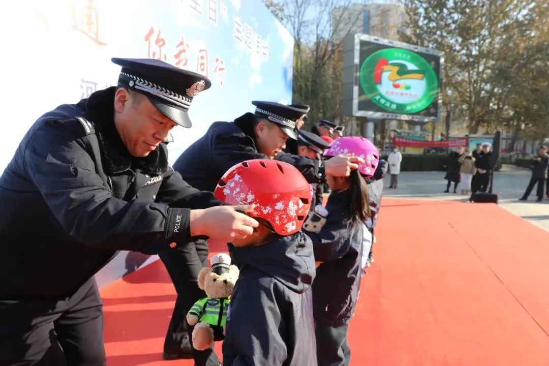 活动现场,民警为学生代表佩戴安全头盔,赠送交警小熊。雄安新区公安局供图