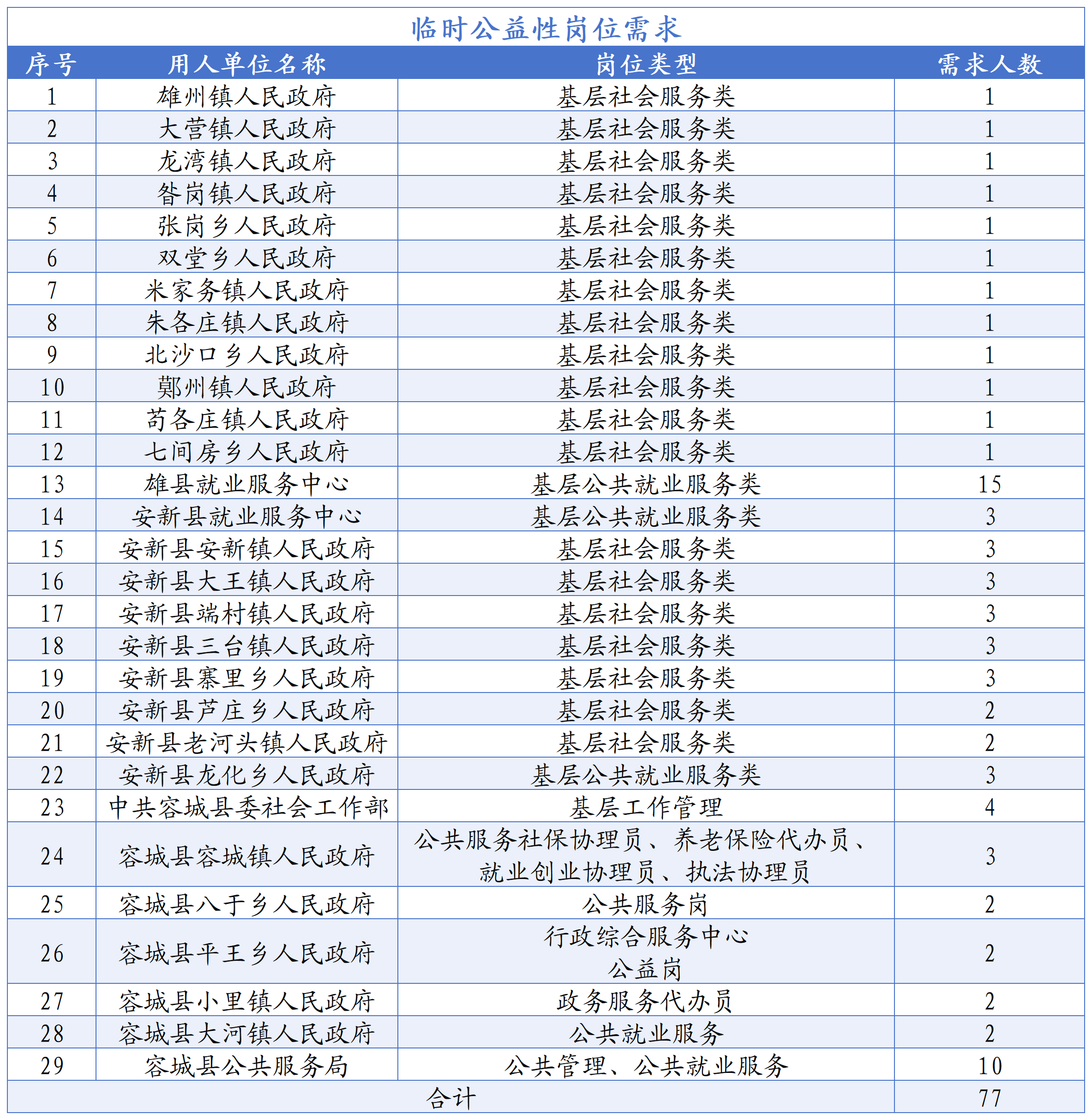 5. 雄安新区公开招募2024年临时公益性岗位人员,共设置77个岗位,具体岗位及联系方式如下: