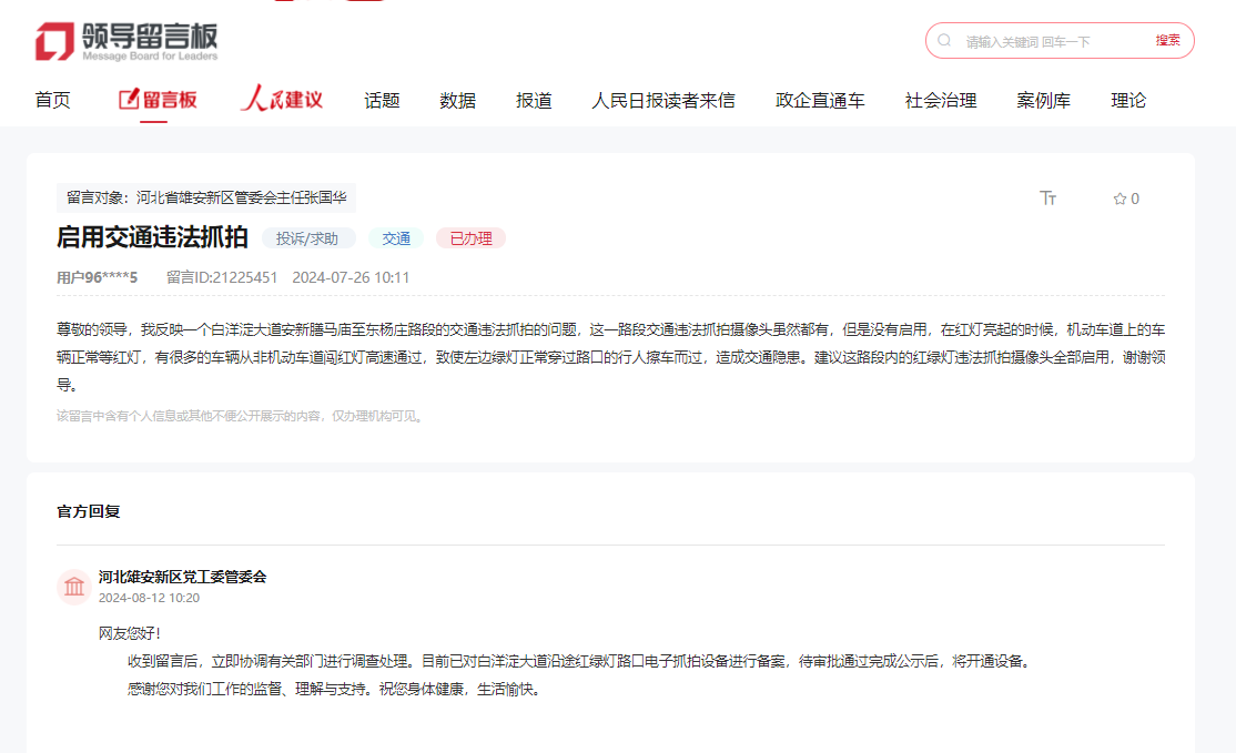 河北雄安新区党工委管委会:网友您好! 收到留言后,立即协调有关部门进行调查处理。目前已对白洋淀大道沿途红绿灯路口电子抓拍设备进行备案,待审批通过完成公示后,将开通设备。感谢您对我们工作的监督、理解与支持。祝您身体健康,生活愉快。