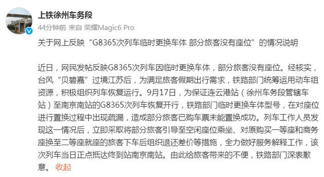 2.18日晚间,@上铁徐州车务段 发布《关于网上反映“G8365次列车临时更换车体 部分旅客没有座位”的情况说明》。