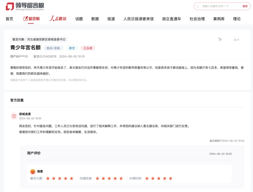 有网友反映,雄安新区容城县青少年宫名额只有七百多,很多孩子没能报名,希望领导重视。
