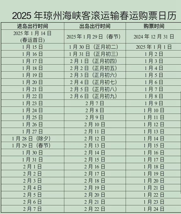 人民网海口1月3日电(记者 毛雷、孟凡盛)为方便广大旅客春节期间出行,自2025年1月4日起,旅客可提前购买大年初五(2025年2月2日)出岛的船票。以下是有关春运期间琼州海峡轮渡出行的最新信息: