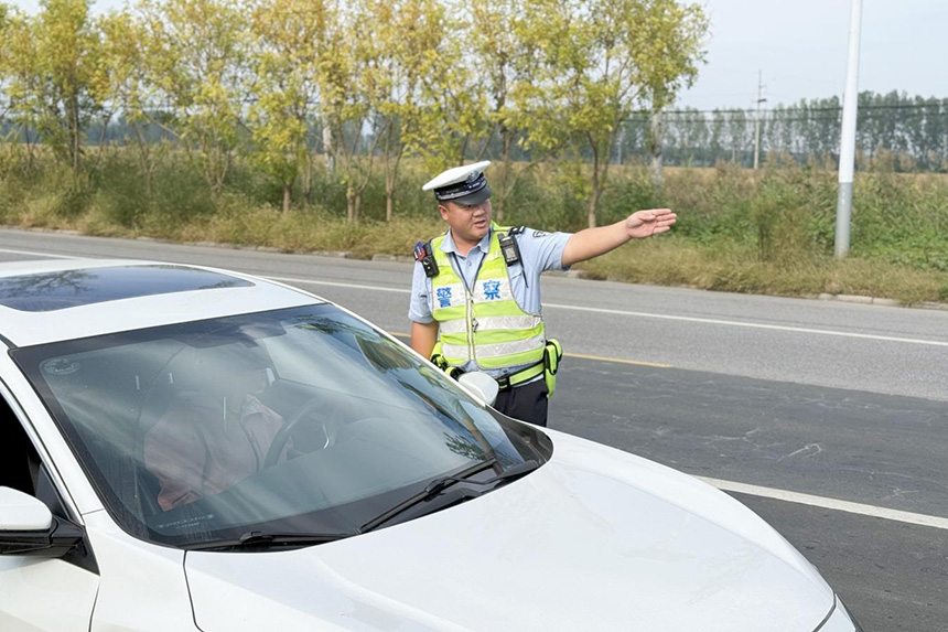 安新县公安局交通管理大队民警在白洋淀景区停车场路段巡逻时为外地牌照车辆指路。李若迪摄